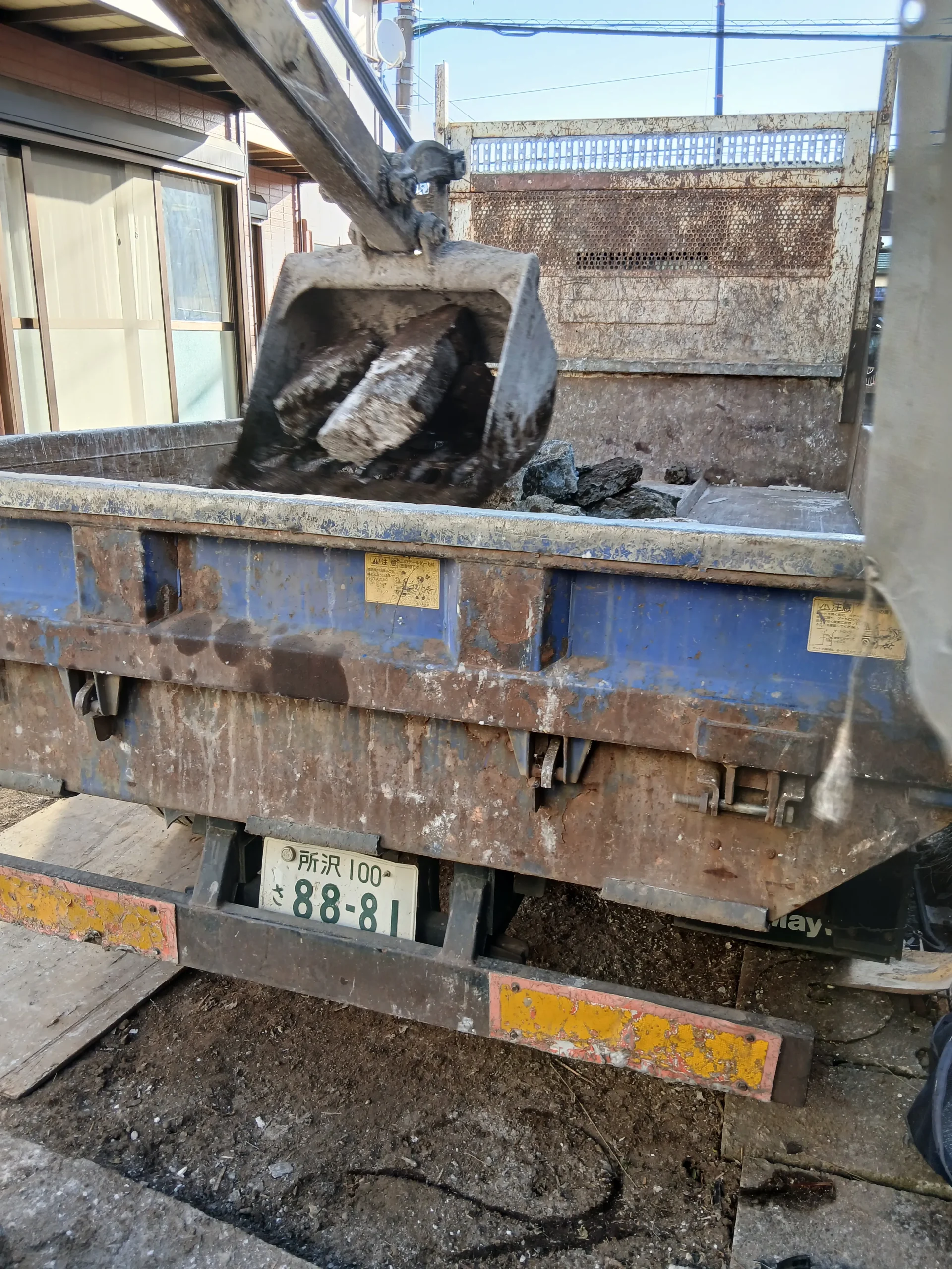 作業​掘り起こした大きなコンクリートの塊は、そのままではダンプに積むことができません。