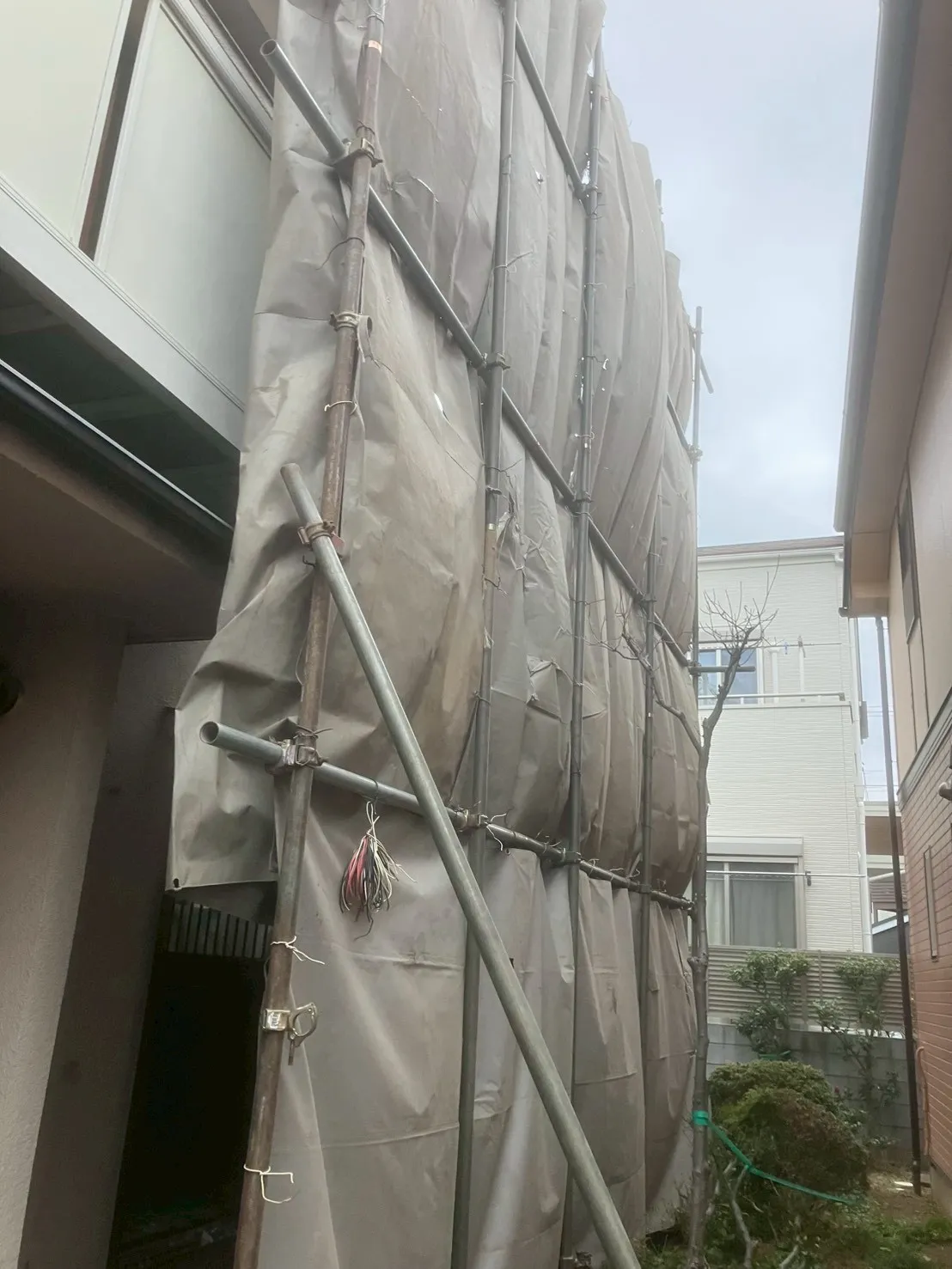 足場をぐるりと囲うように養生シートを設置しました。