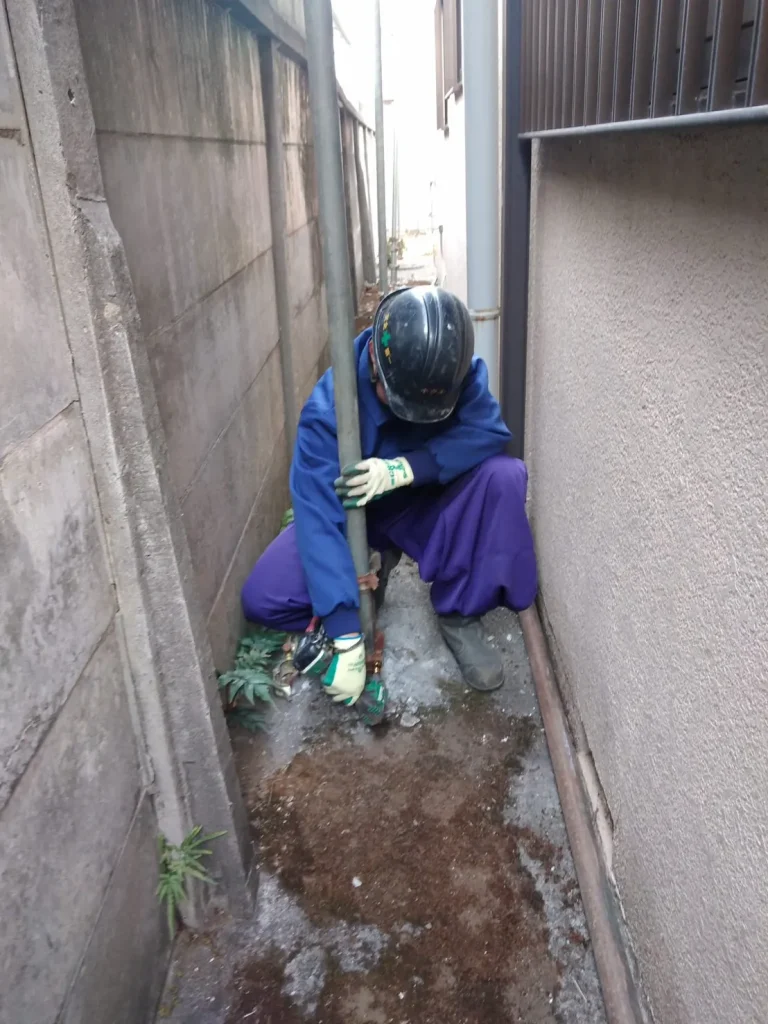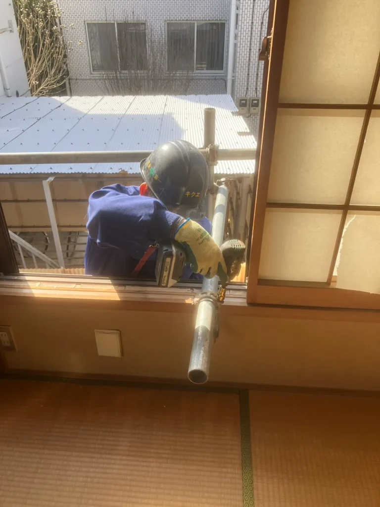 そのため、私たちは「控え」(やらず)と呼ばれるパイプを使い、建物本体と足場をしっかりと繋ぎ合わせます。