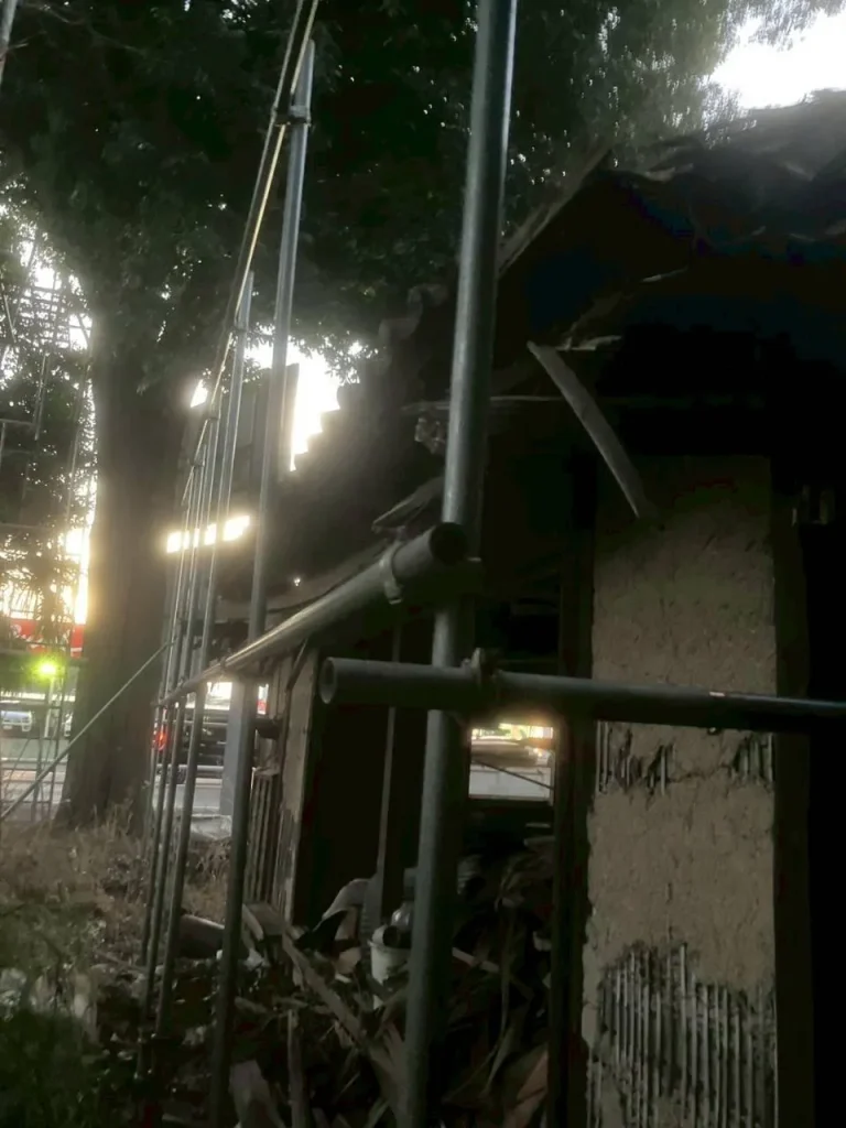 万が一の強風でも足場が揺らいだり、倒壊したりすることがないよう、斜めに「控え(補強材)」をしっかりと組み込みました。